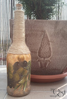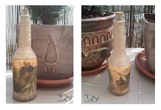 Butelka na oliwę wykonana techniką decoupage. Butelka cała pokryta jest złotą farbą co nadaje jej ciekawy efekt. Do wykończenia użyłam sznurka lnianego.